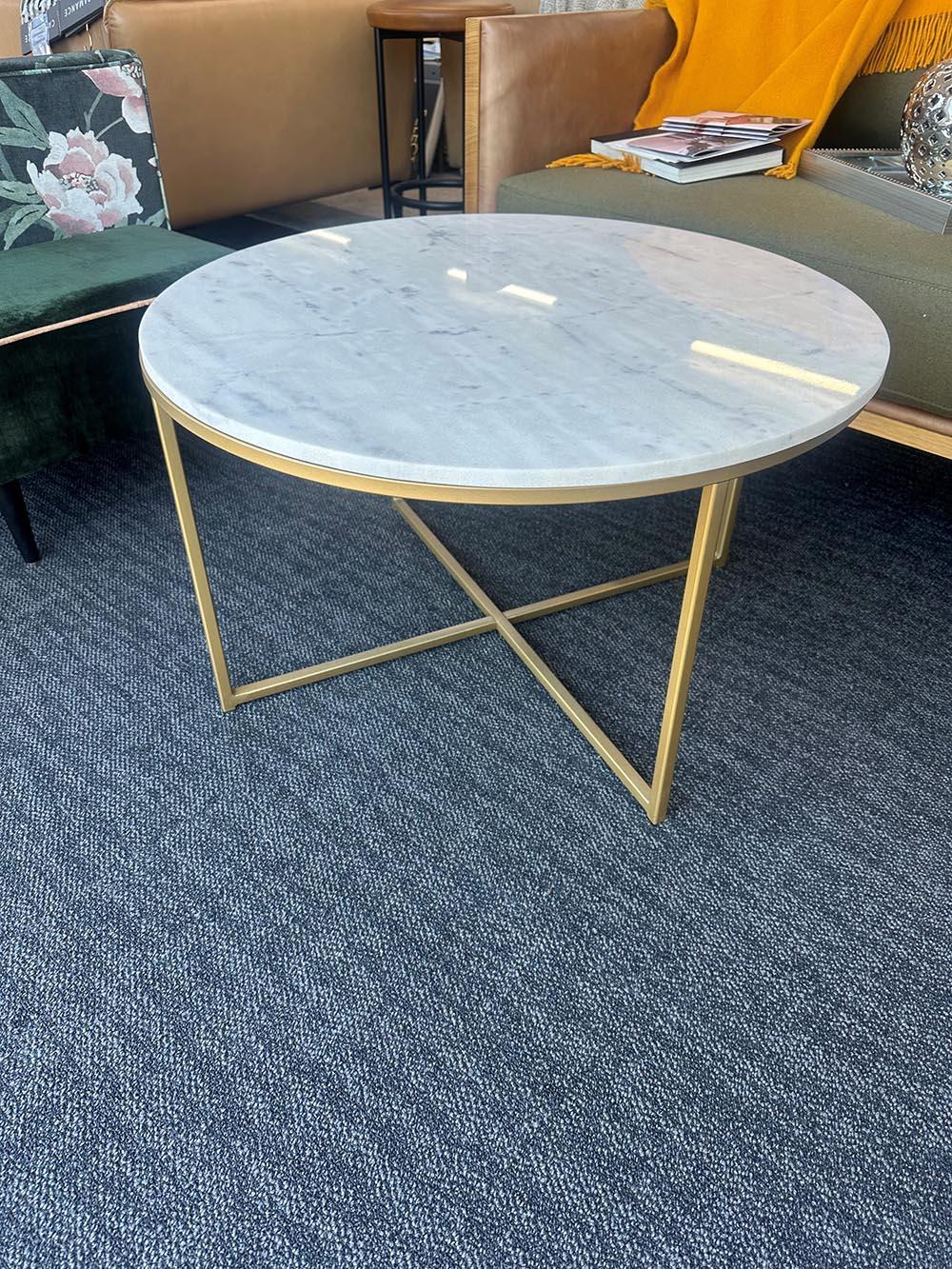Contemporary style coffee table (800mm DIA x 465mm high overall). Marble top with gold cross frame.